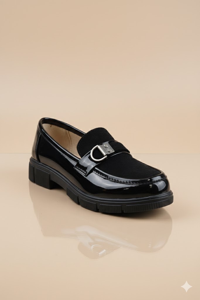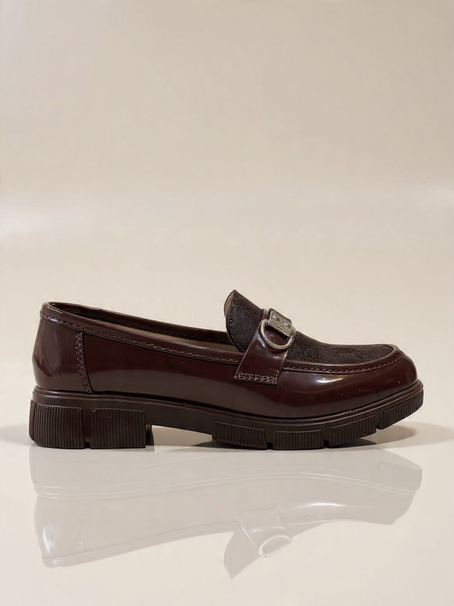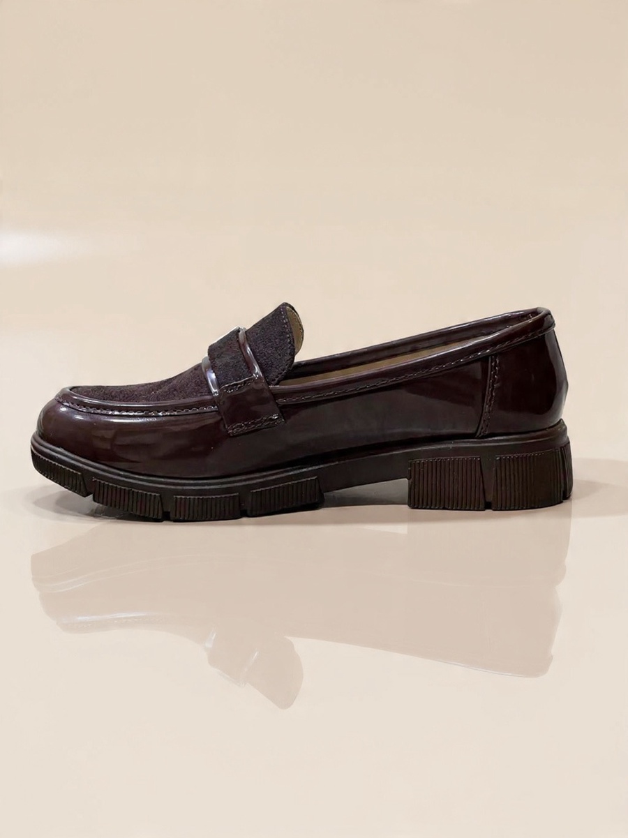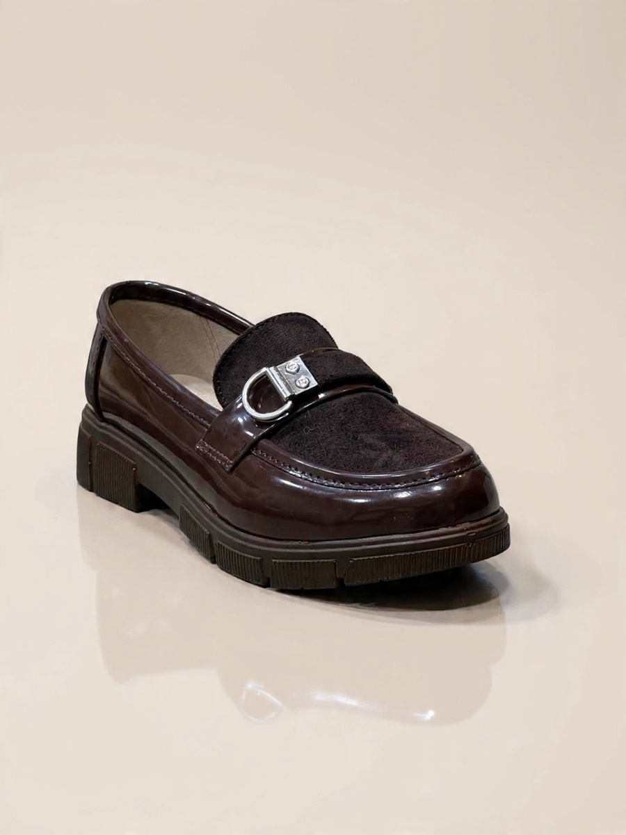Stylish burgundy women's loafer featuring a luxurious mix of patent leather and suede, adorned with a decorative O-ring buckle. Set on a bold, comfortable chunky lug sole. Adds an edgy yet chic touch, perfect for work or stylish casual wear in the fall