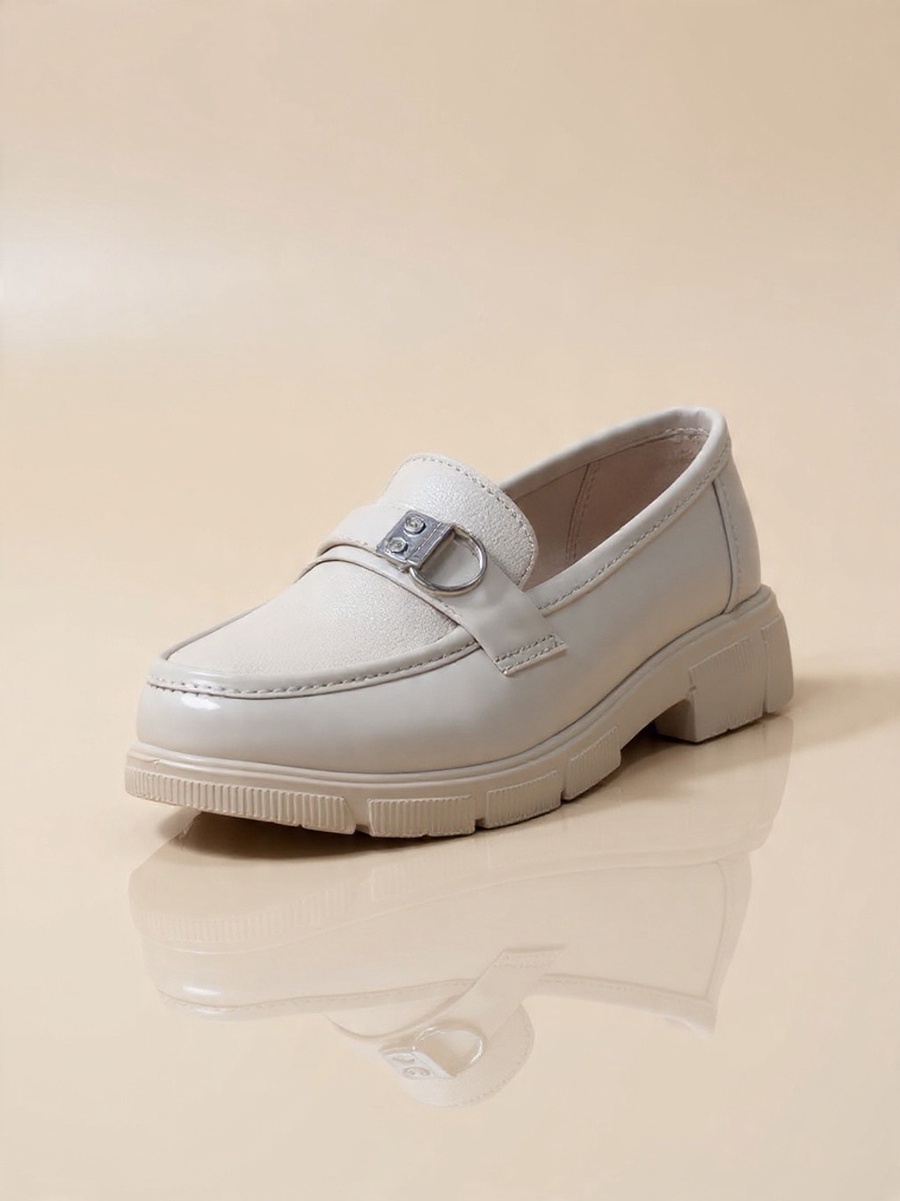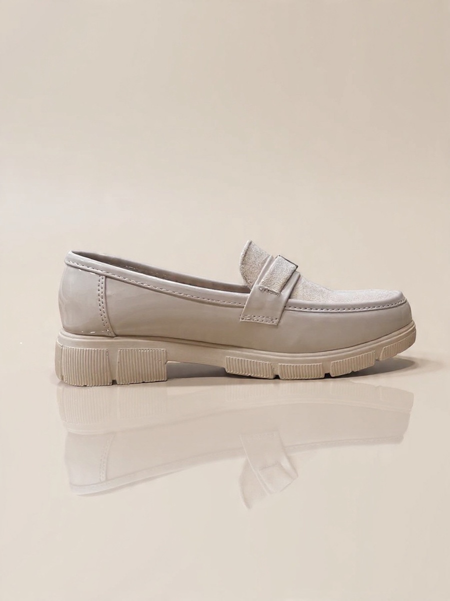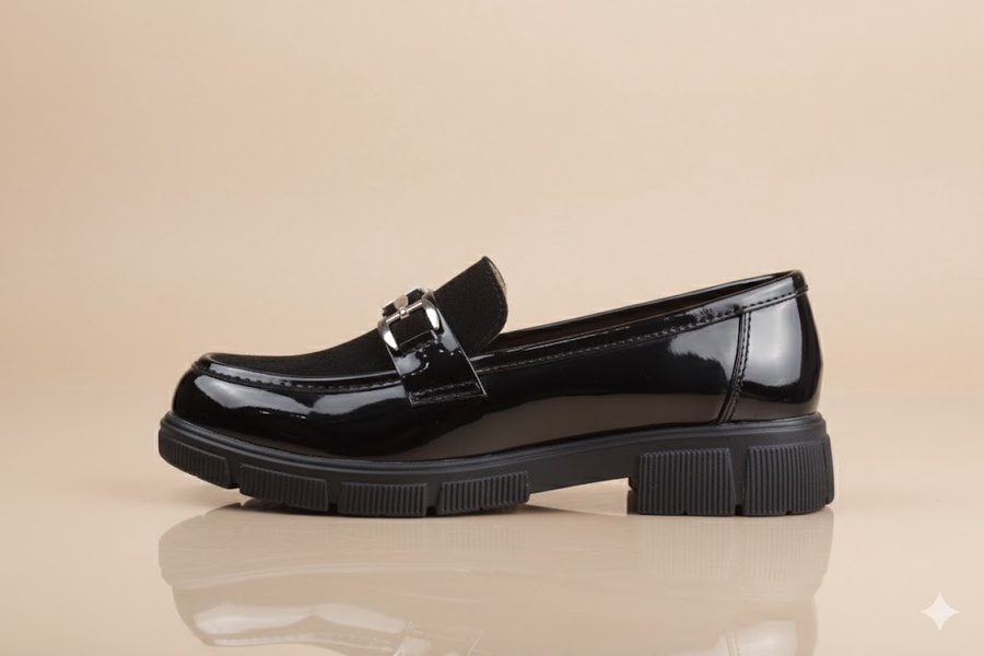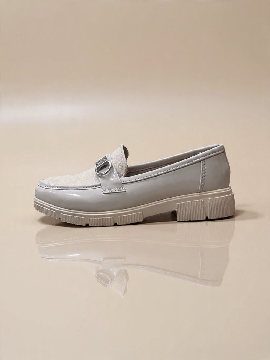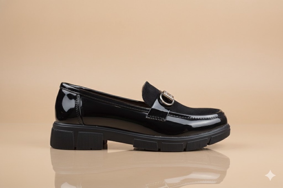 Stylish burgundy women's loafer featuring a luxurious mix of patent leather and suede, adorned with a decorative O-ring buckle. Set on a bold, comfortable chunky lug sole. Adds an edgy yet chic touch, perfect for work or stylish casual wear in the fall