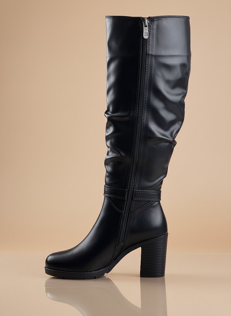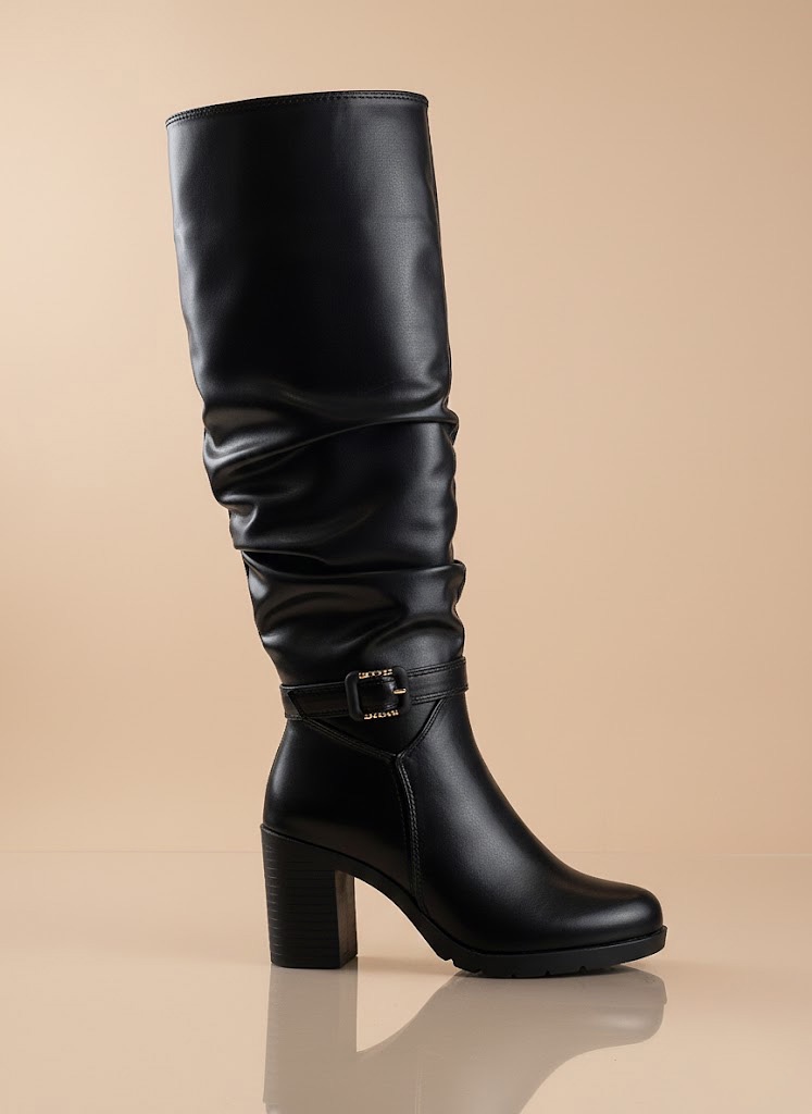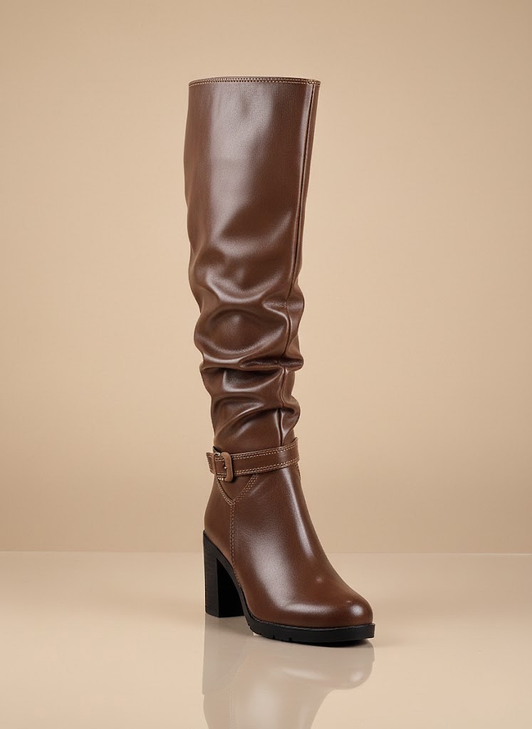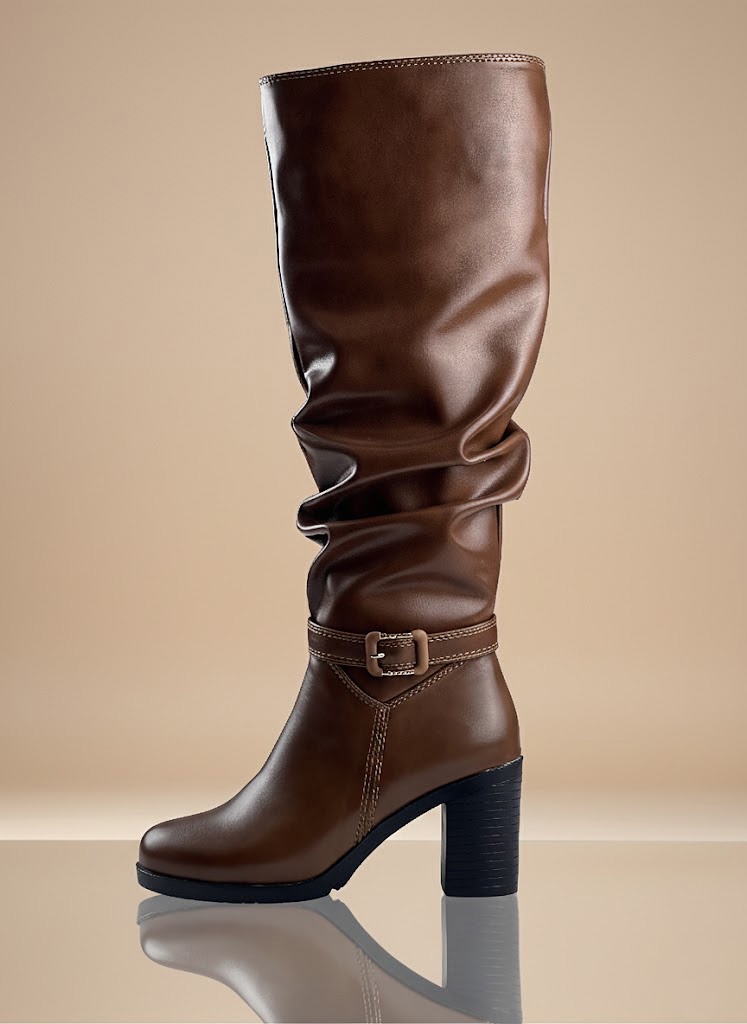 Make a statement with our tall brown knee-high boot, featuring a fashionable slouchy shaft and a sturdy block heel. Designed with a stylish ankle buckle detail, these boots combine comfort and bold elegance. Perfect for pairing with dresses or skinny jeans this cold season